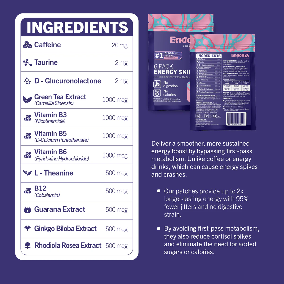 • 5 Packs, 6 Patches Each: That’s up to 30 days of unstoppable momentum. Perfect for busy weeks or sharing a boost with friends.